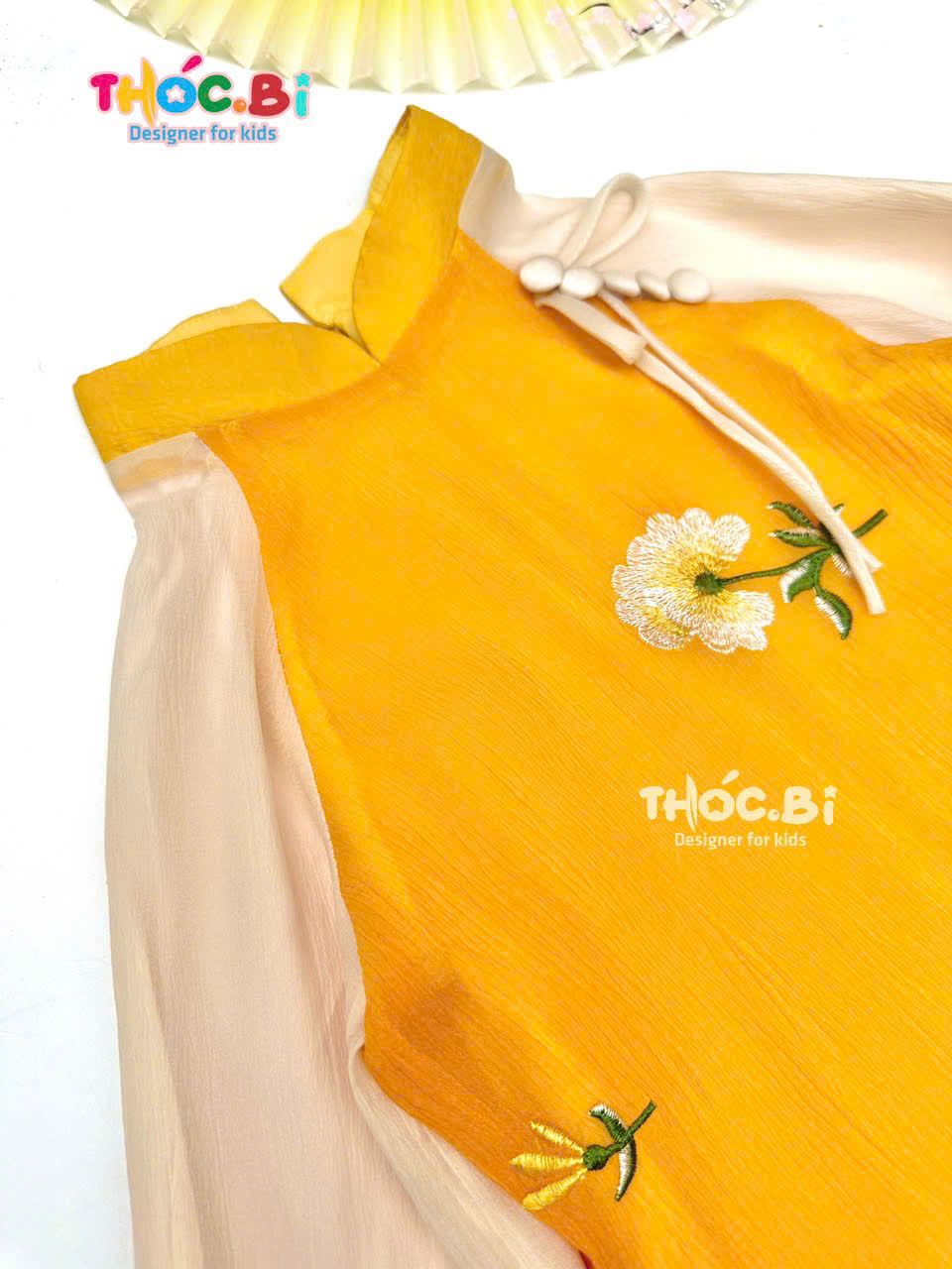 Bộ áo dài bé gái Th36 vàng hoa cúc kèm mấn vàng GPK032 - GAD031
