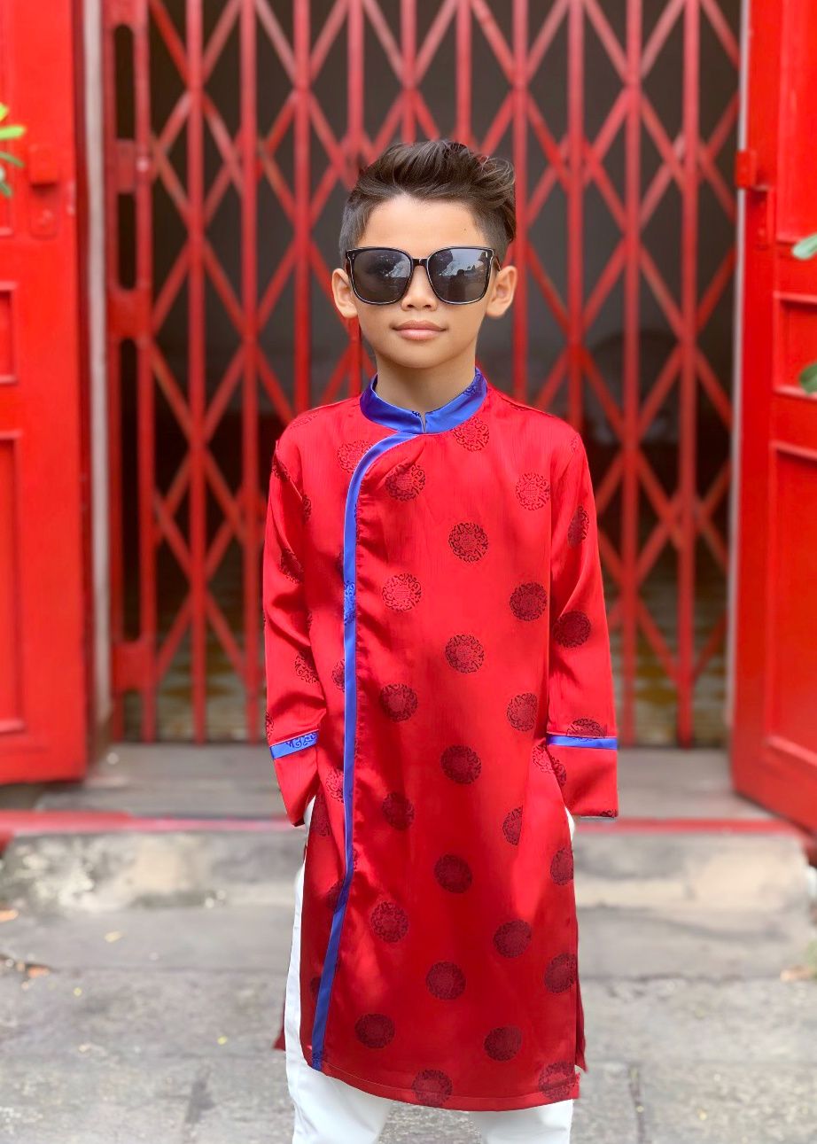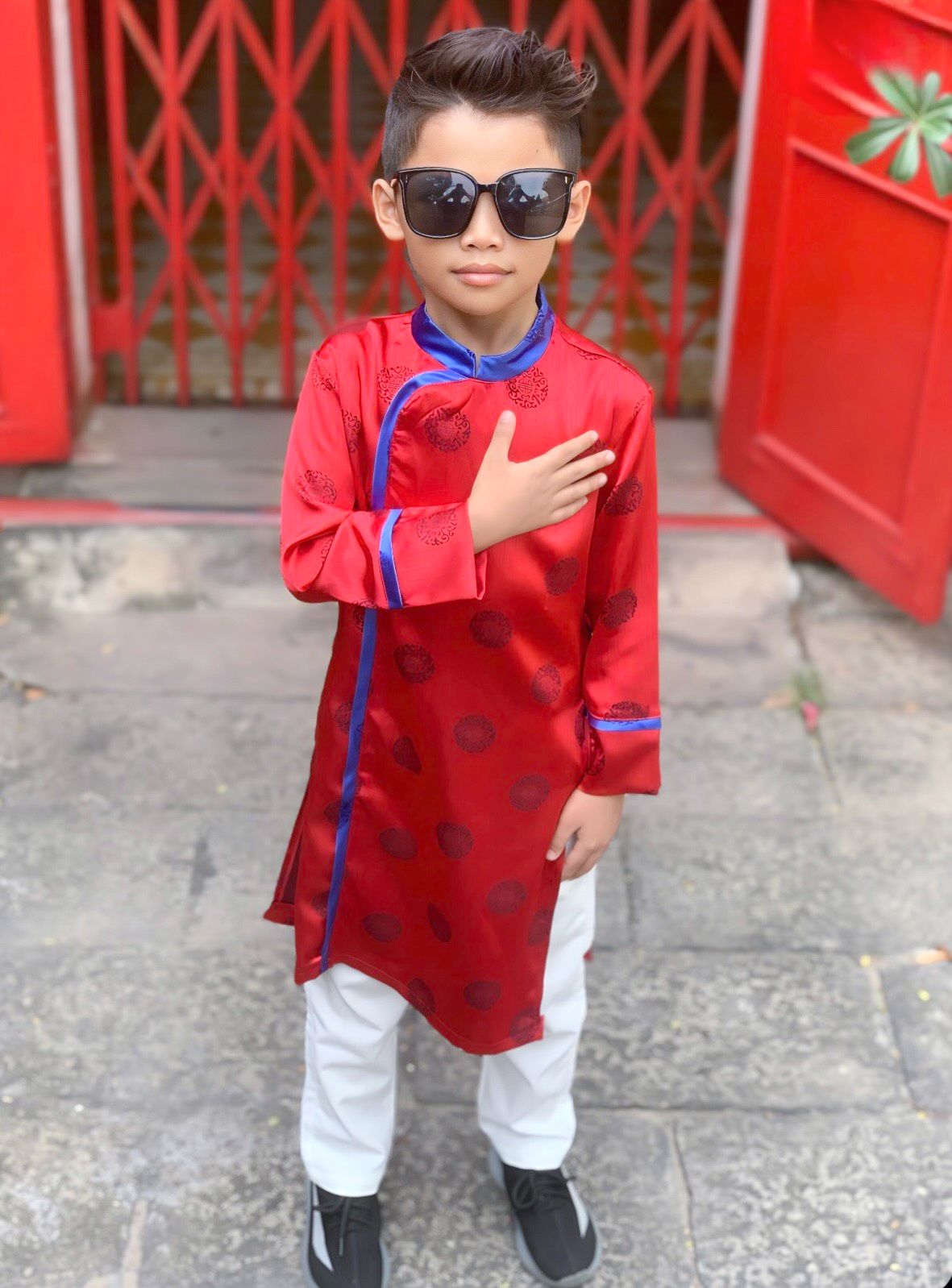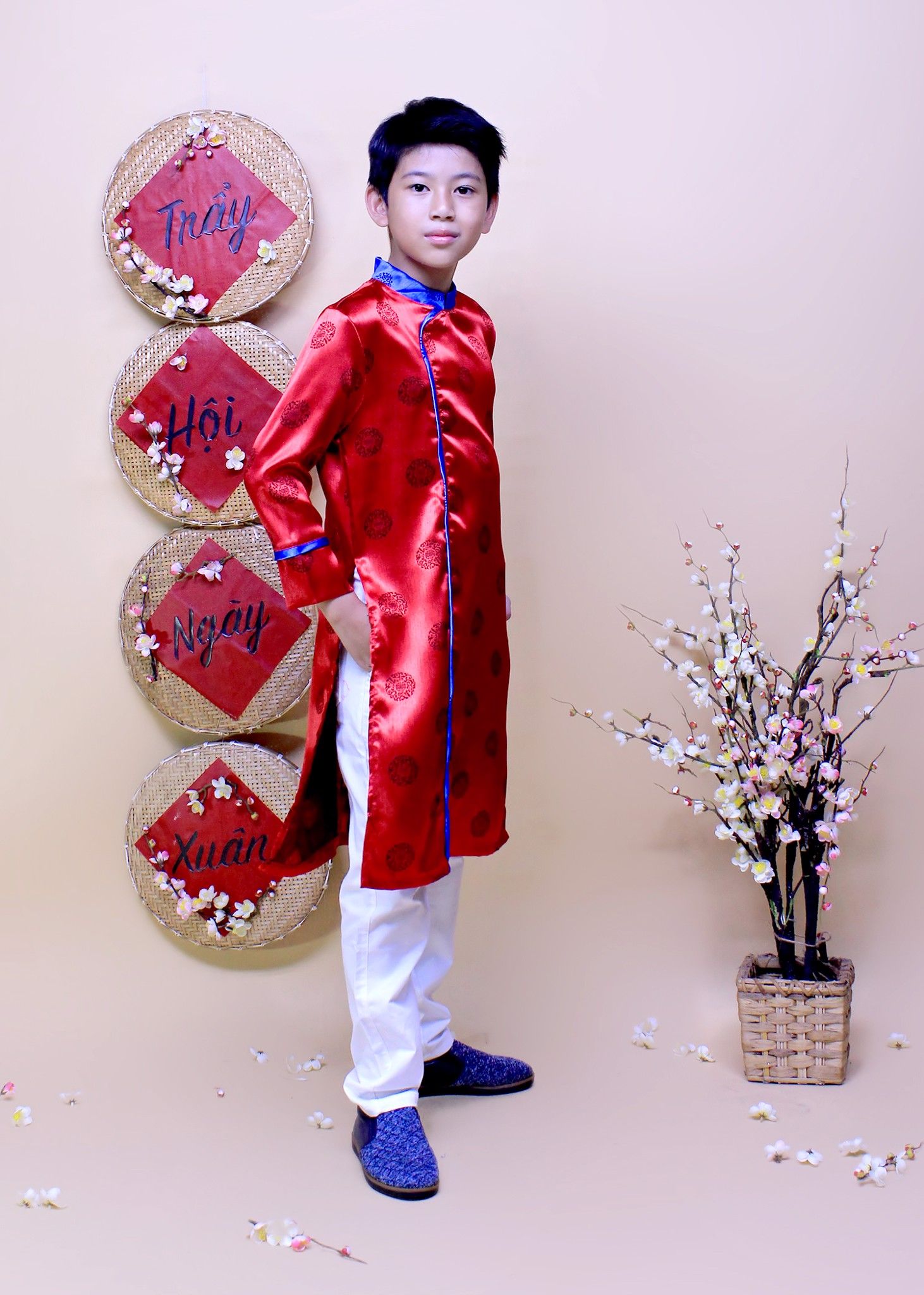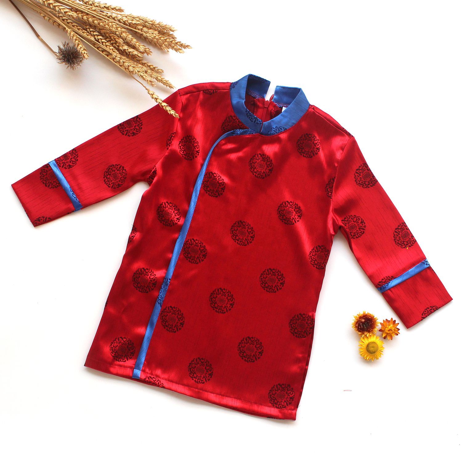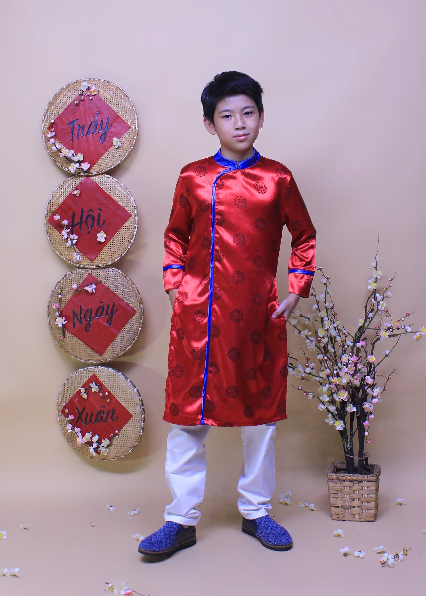 Áo dài bé trai đồng tiền đỏ may mắn - TAD011
