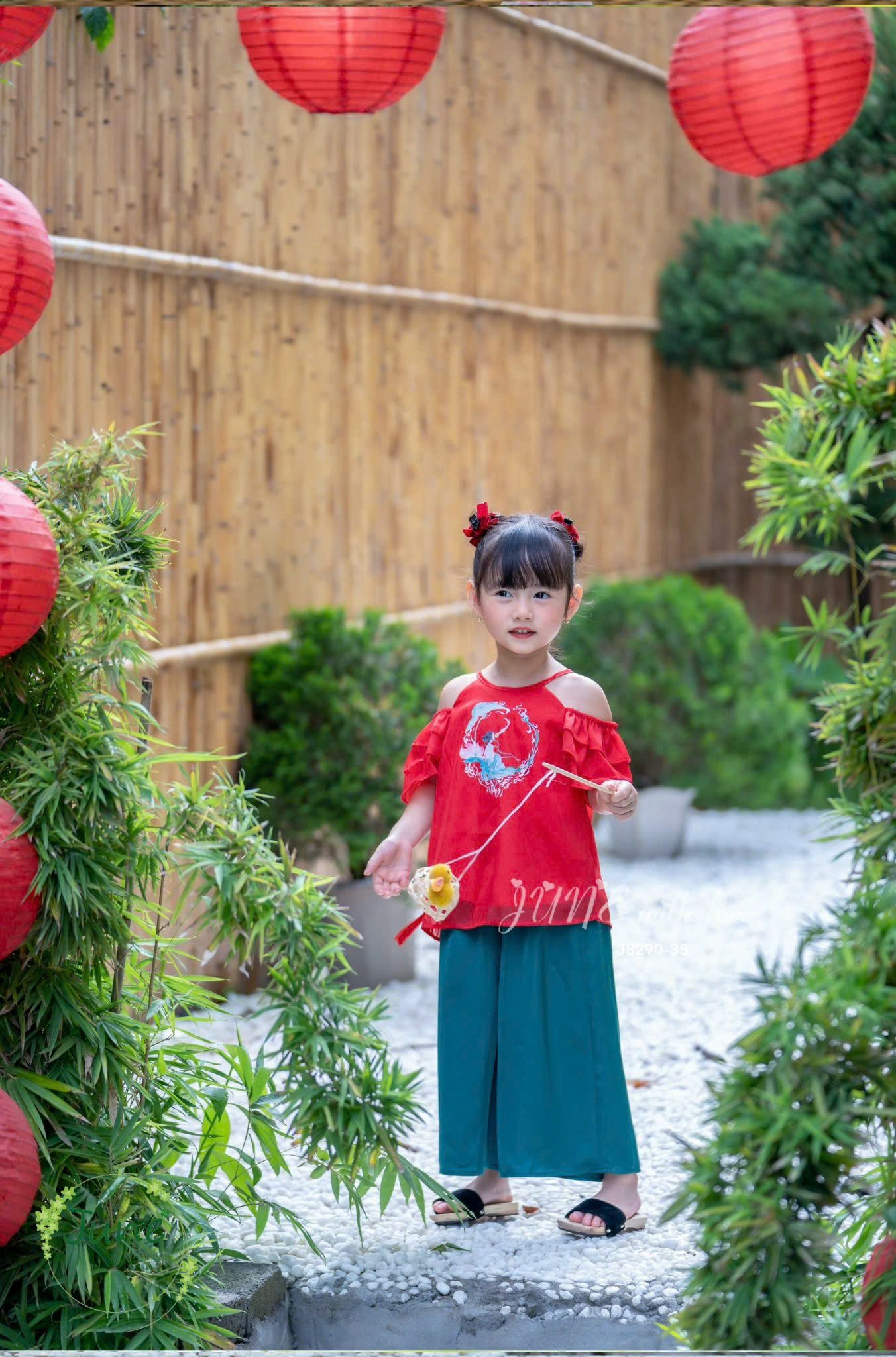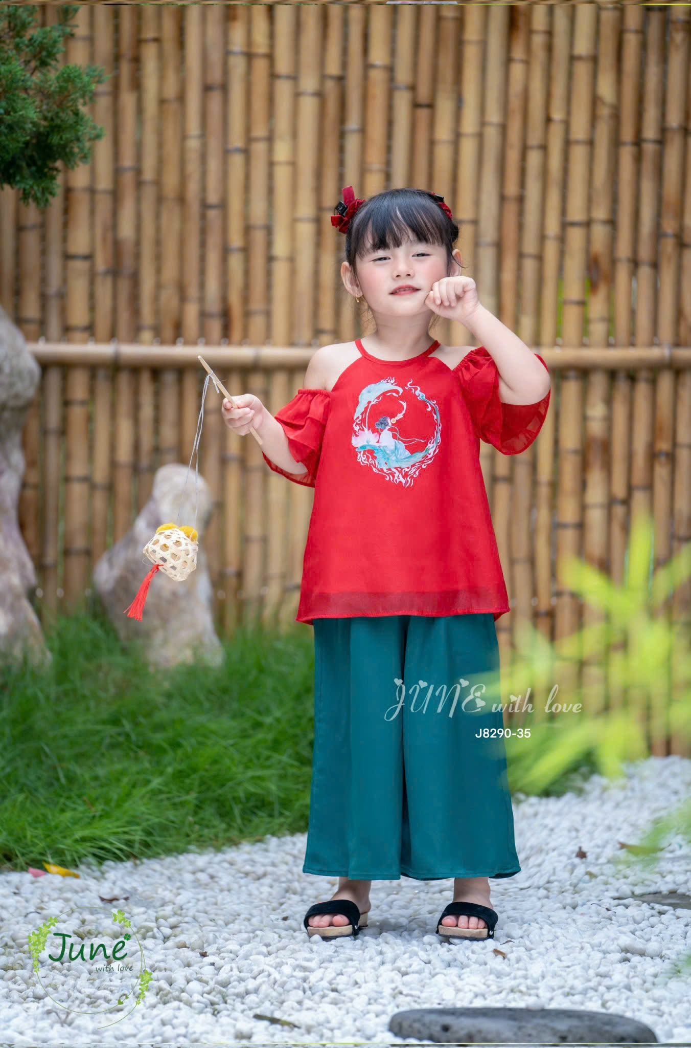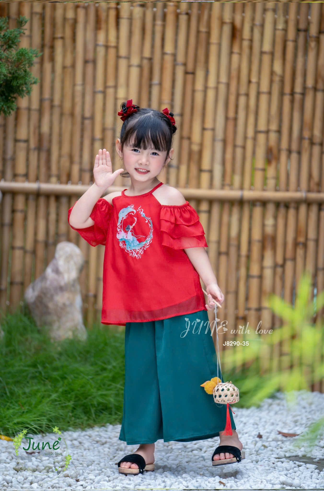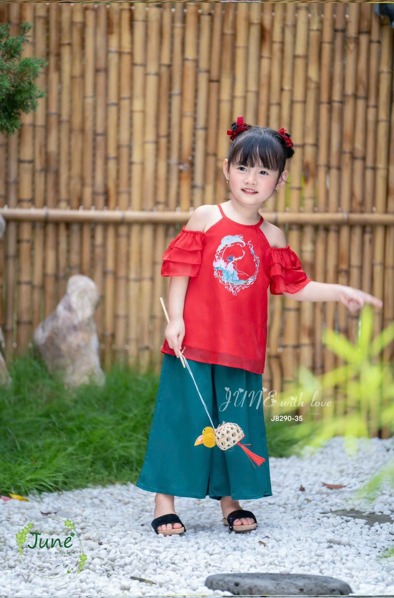 Bộ quần áo bé gái yếm lụa J8290 đỏ may mắn