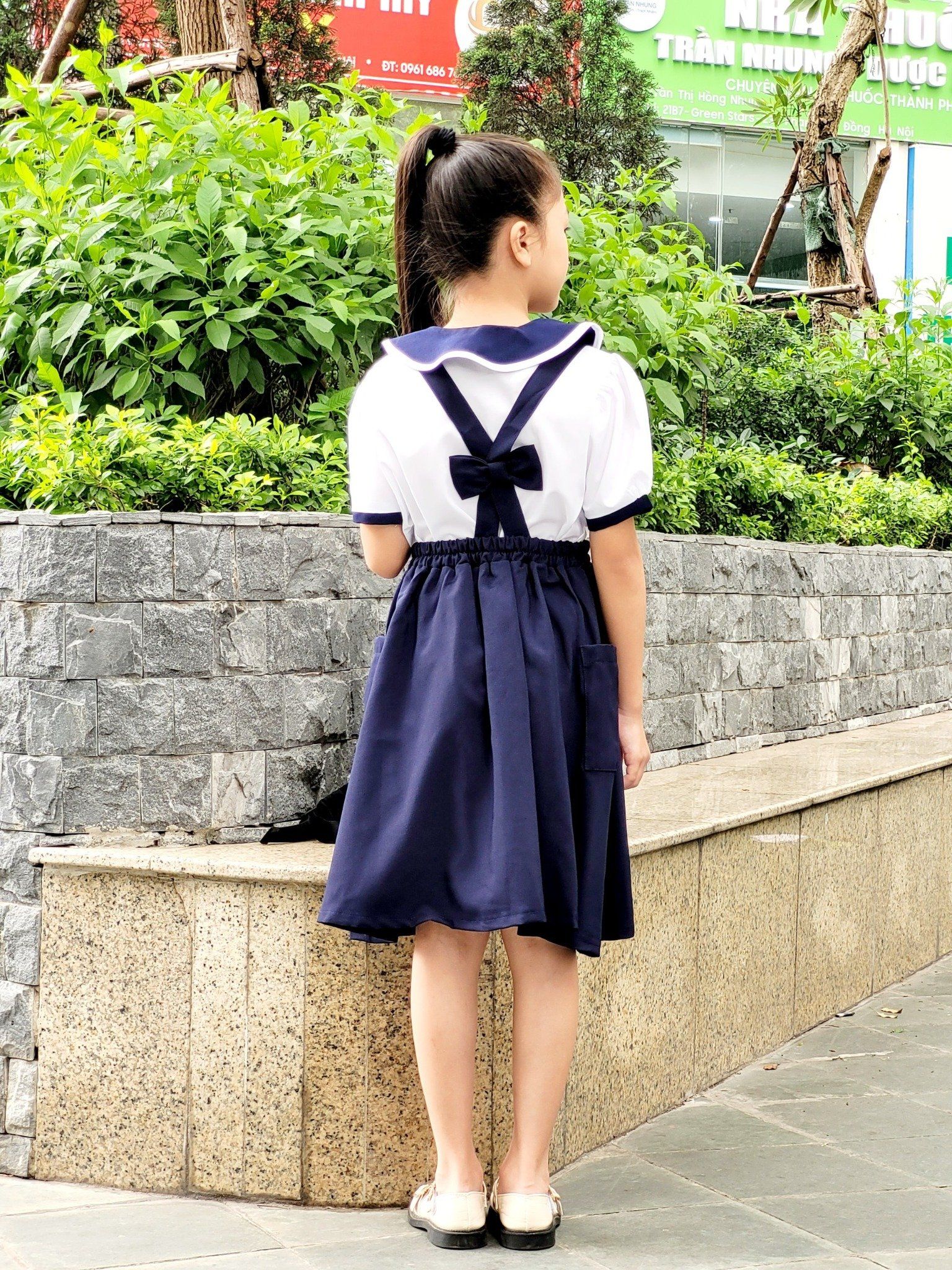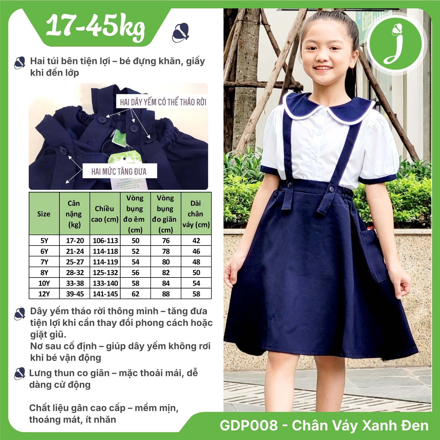 Chân váy yếm cho học sinh 2 túi bên nơ sau - GDP008