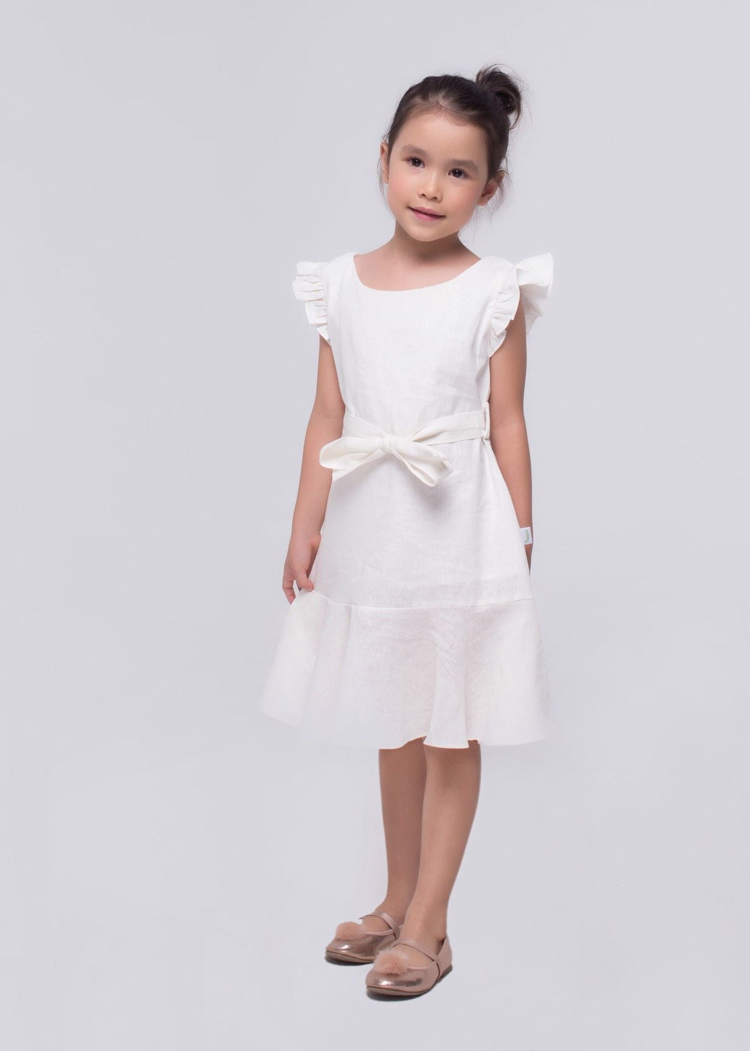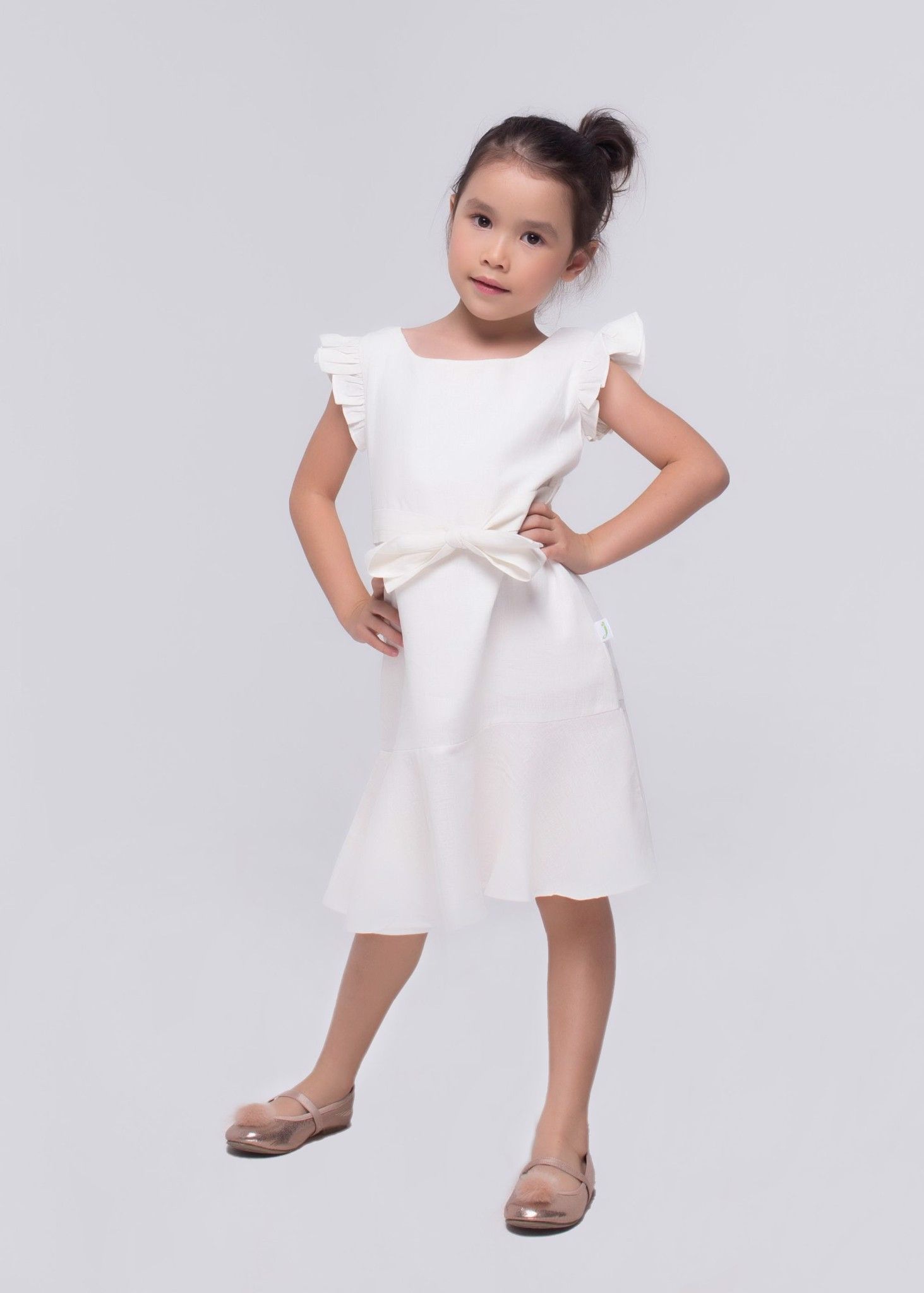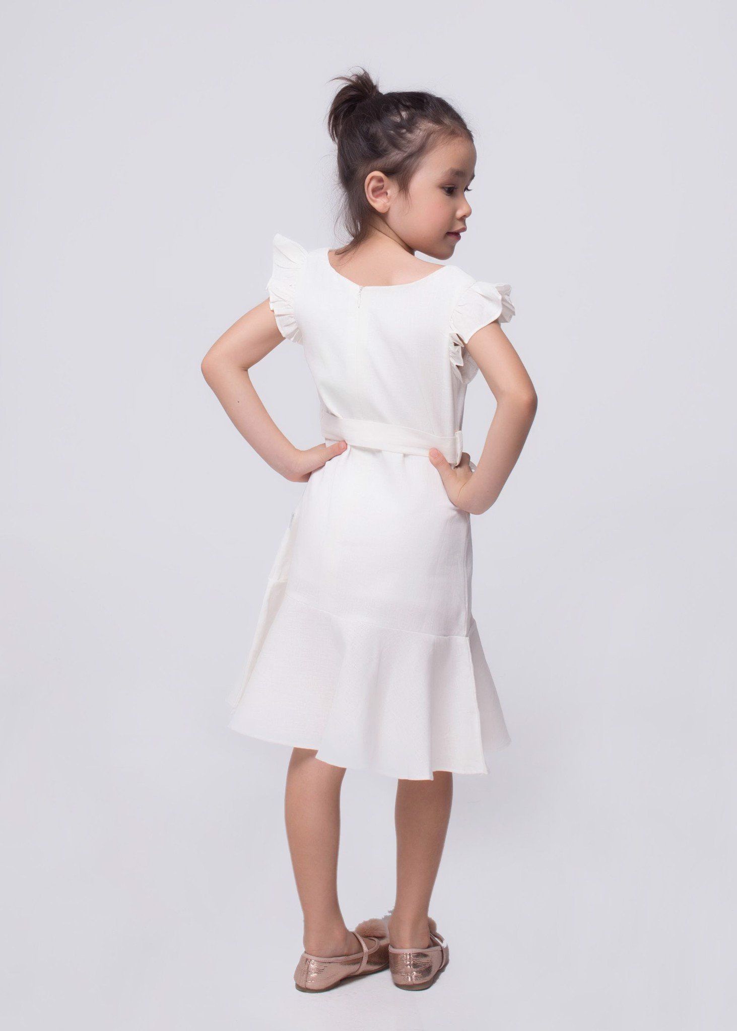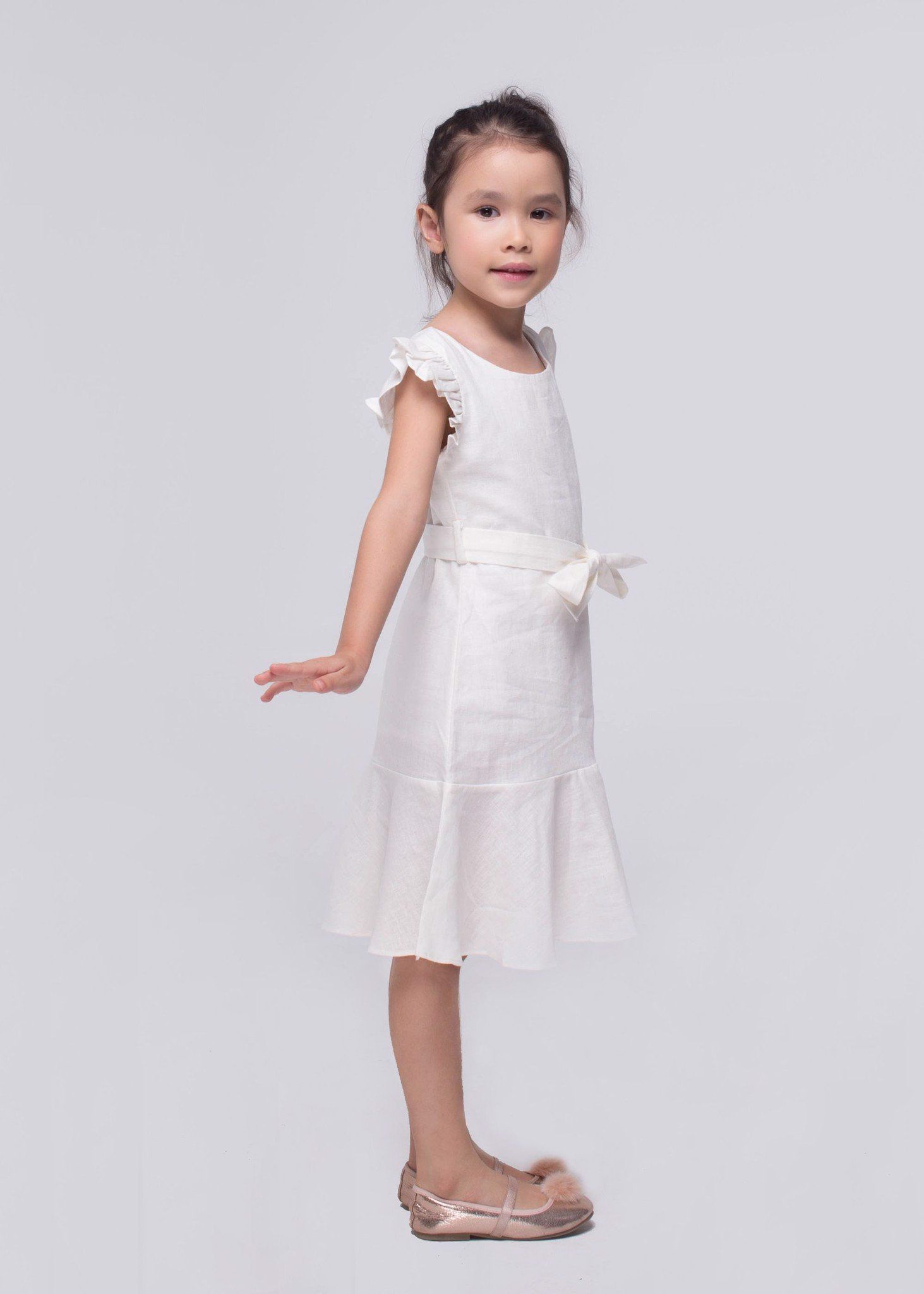 Đầm cổ thuyền bèo chân linen trắng bé gái - DG185