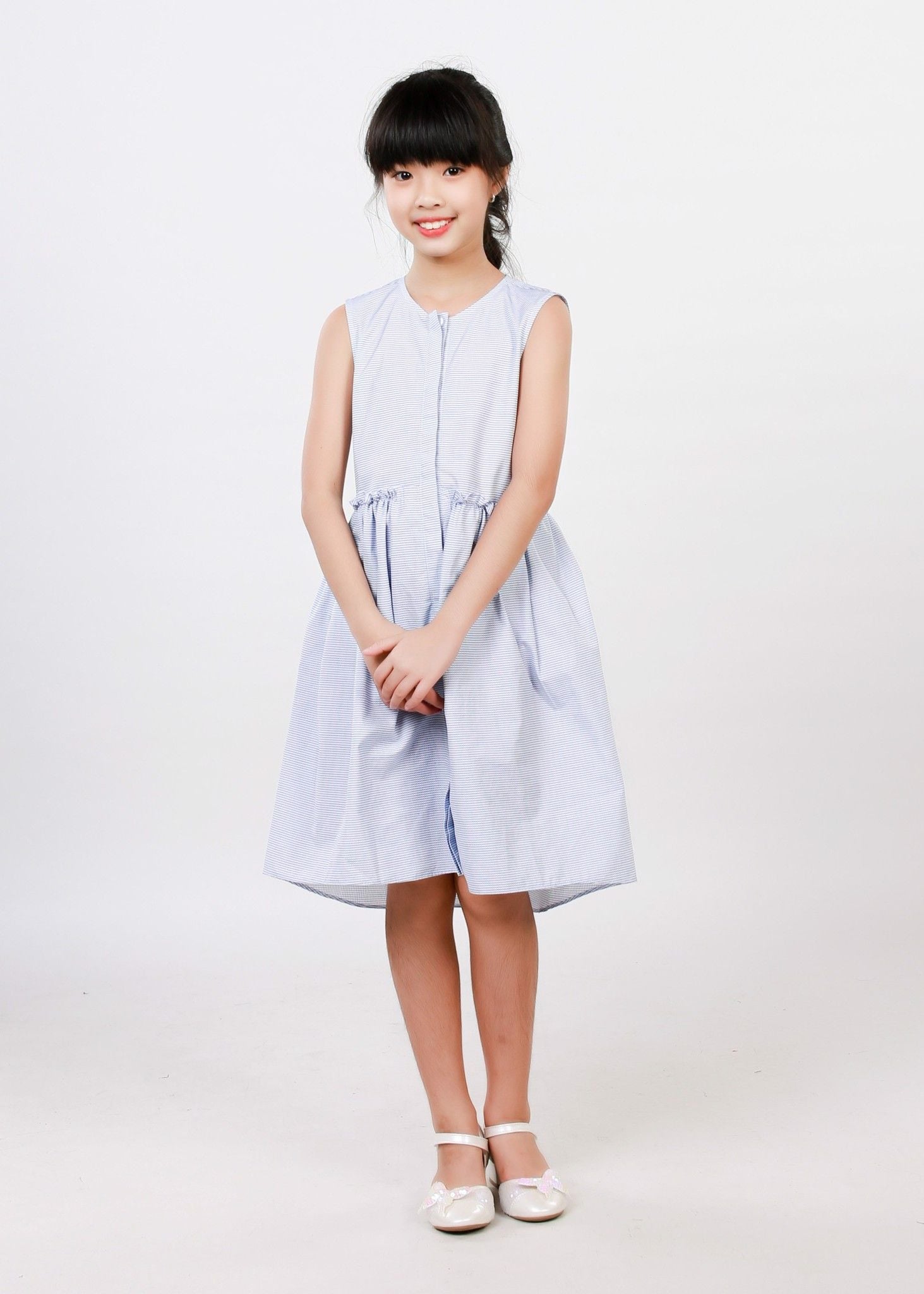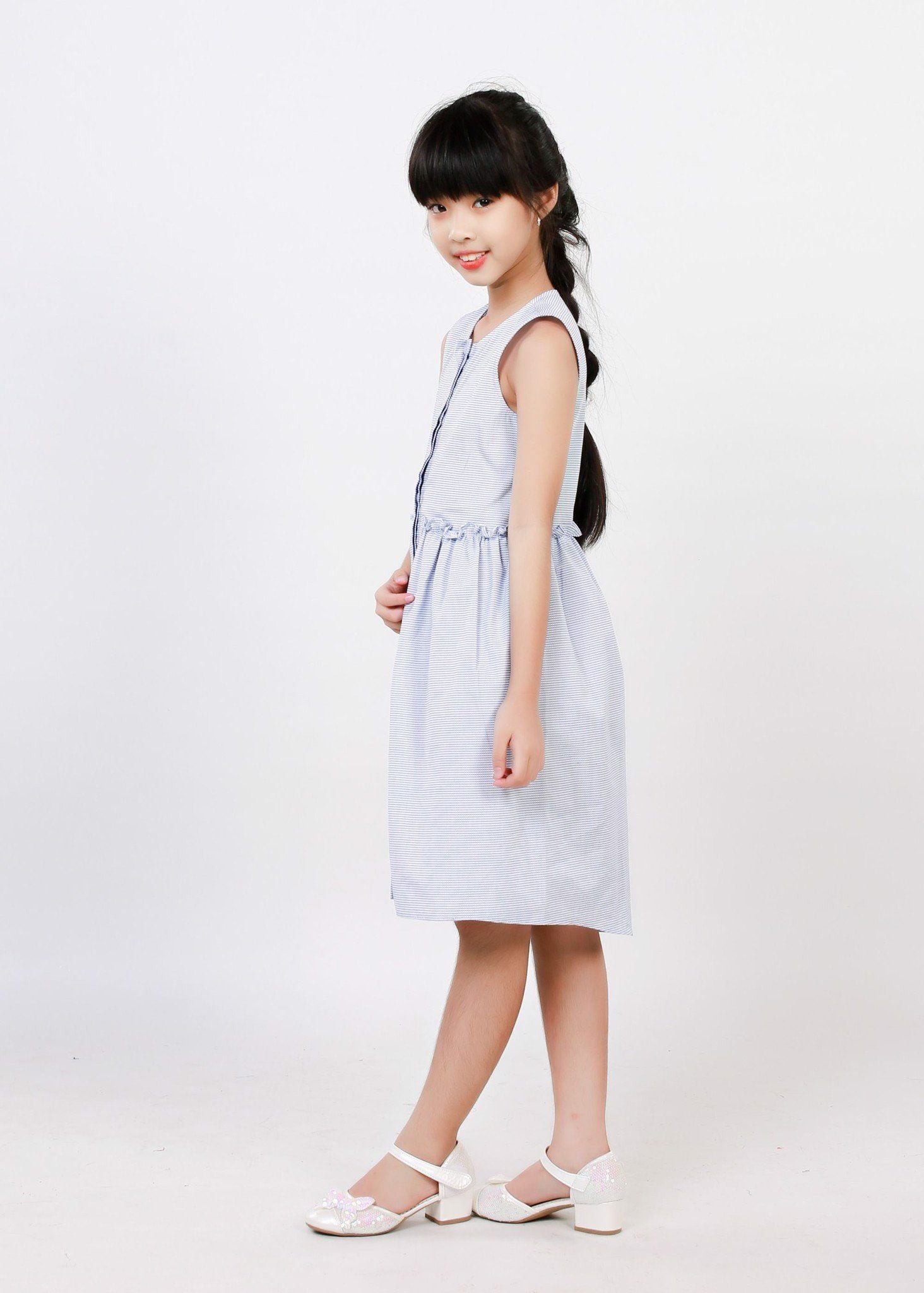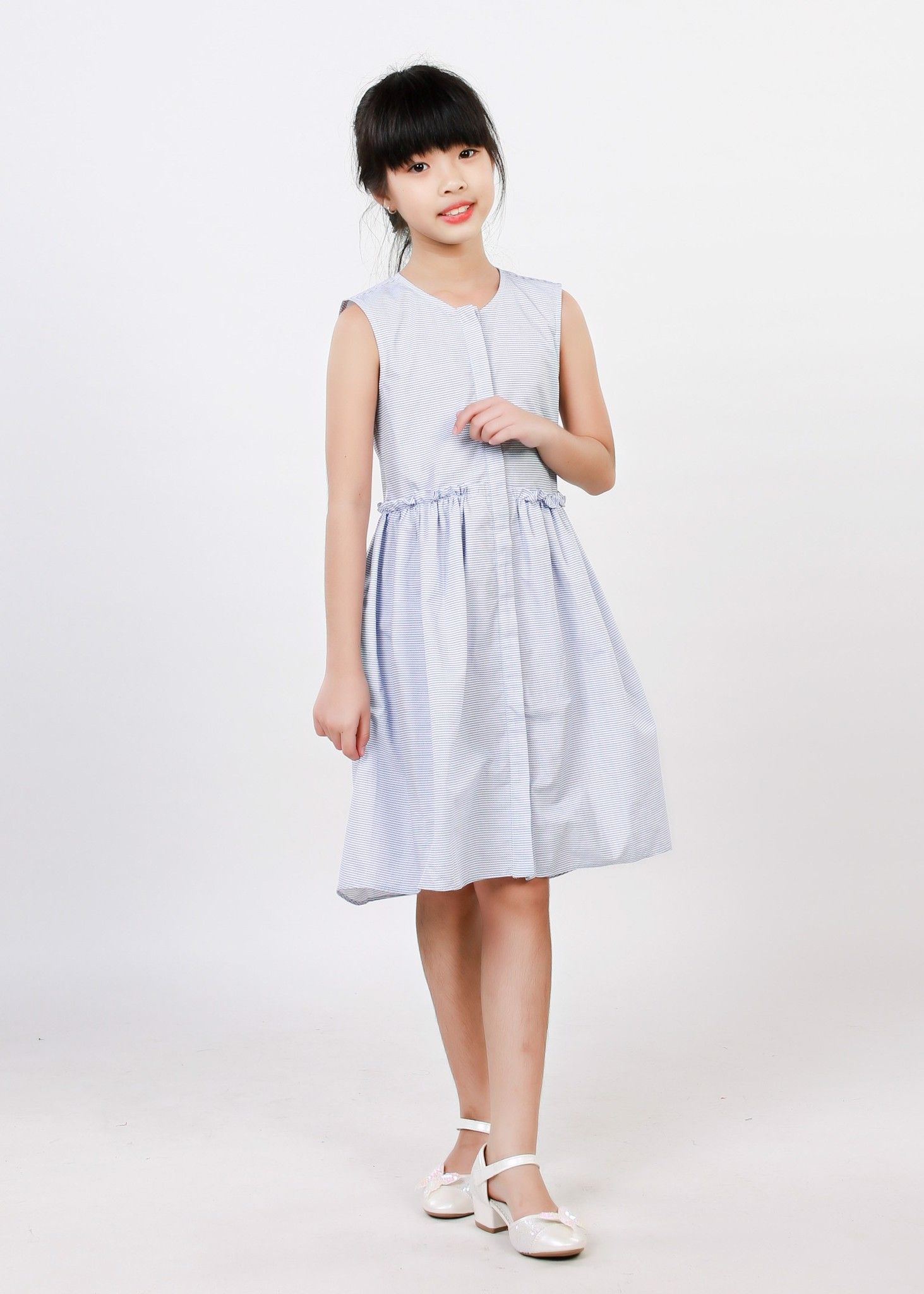 Đầm nẹp dọc trắng xanh biển bé gái - DG191