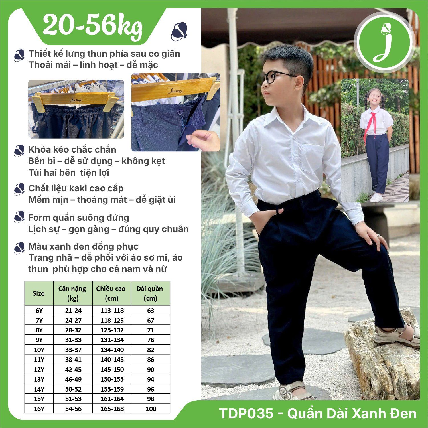 - Chất liệu: Kaki cao cấp mềm mịn, thoáng mát, co giãn nhẹ, ít nhăn và dễ giặt ủi. - Form quần: Dáng suông, thoải mái, phù hợp nhiều dáng người. - Thiết kế: Lưng thun co giãn + khóa kéo chắc chắn, tiện lợi. - Màu sắc: Xanh đen – phù hợp với tiêu chuẩn đồng phục học sinh. - Size: Dành cho học sinh từ 20kg đến 55kg.