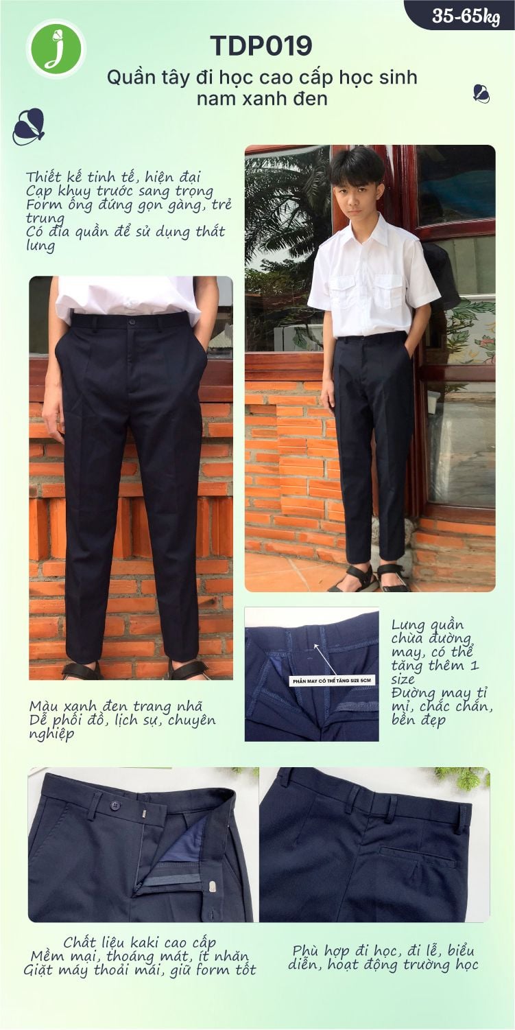 Quần tây này được thiết kế đặc biệt để mang đến vẻ ngoài lịch sự và chuyên nghiệp cho học sinh nam trong các buổi học và sự kiện trường học. Màu xanh đen tạo nét trang nhã và dễ dàng phối hợp với nhiều trang phục khác.