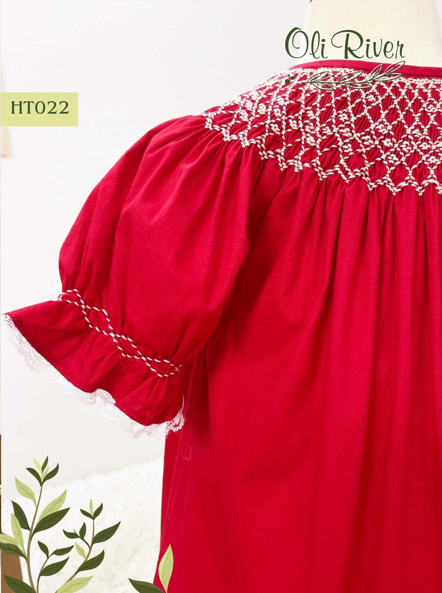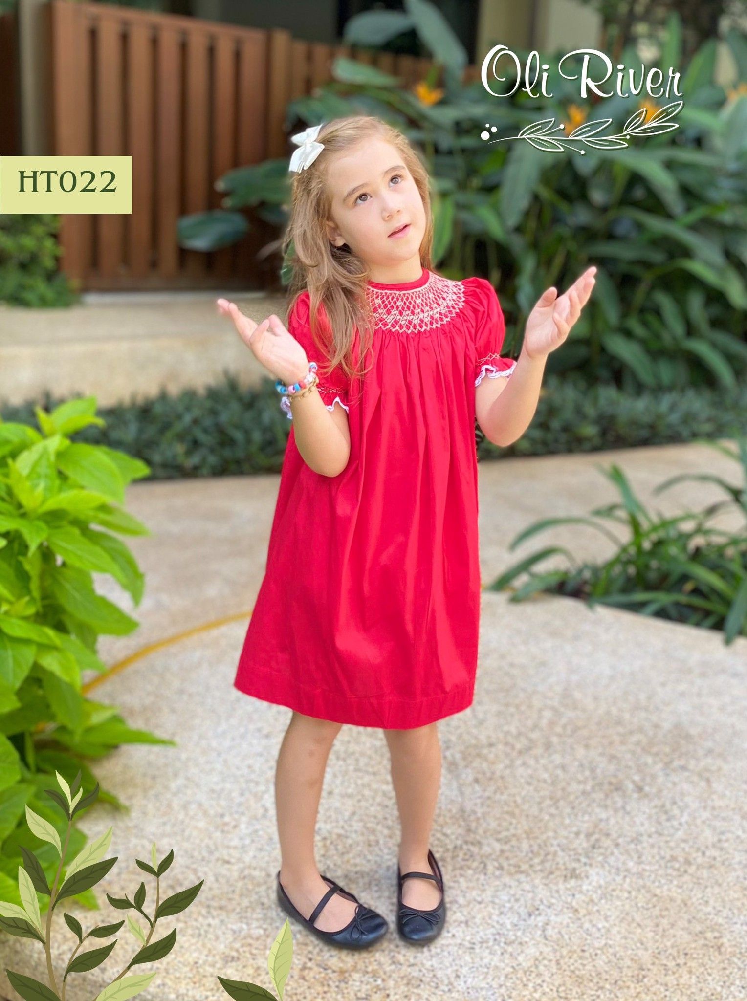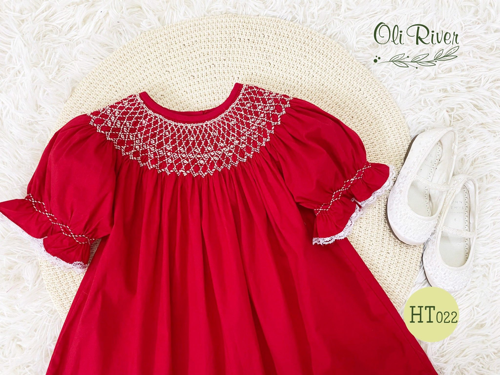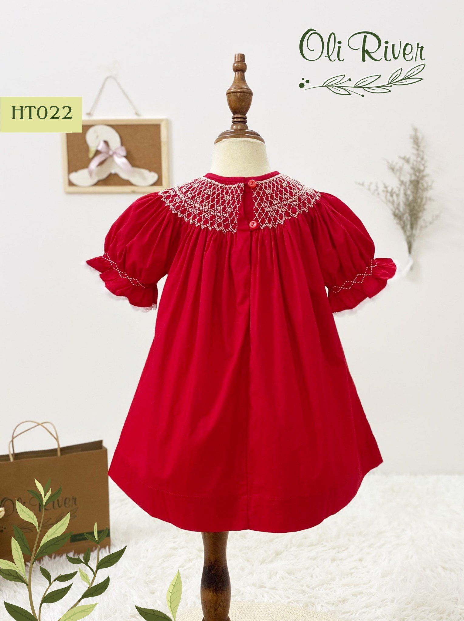 HT022 - Váy Smock bé gái OLIRIVER dáng chữ A tay bồng cùng bản Smock ở cổ siêu xinh